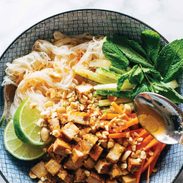 Vermicelli salad in a bowl with tofu and herbs.